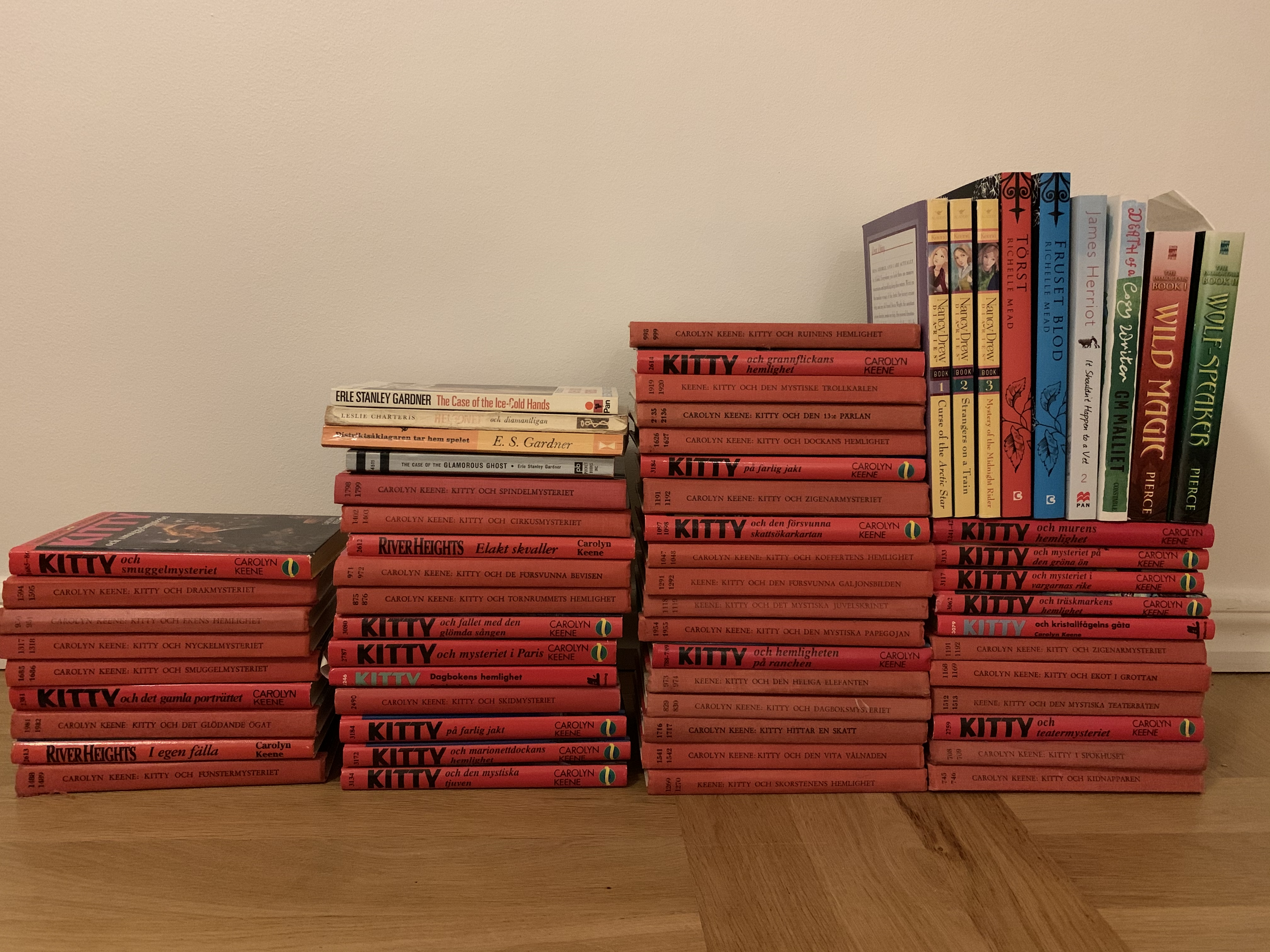 I helgen var jag hemhemma och hämtade lite böcker. Jag åkte kollektivt i olika former tillbaka till lägenheten och jag är lite imponerad över hur många jag fick med mig, det var dock lite tungt att bära böckerna den sista biten. Det var mestadels Kitty-böcker som fick följa med (men jag tror jag har mer än hälften kvar?) men också några andra som slank med. Har jag inte räknat fel så var det 63 böcker som följde med mig (de på bilden) och sen ytterligare tre stycken som både åkte dit och tillbaka igen.
