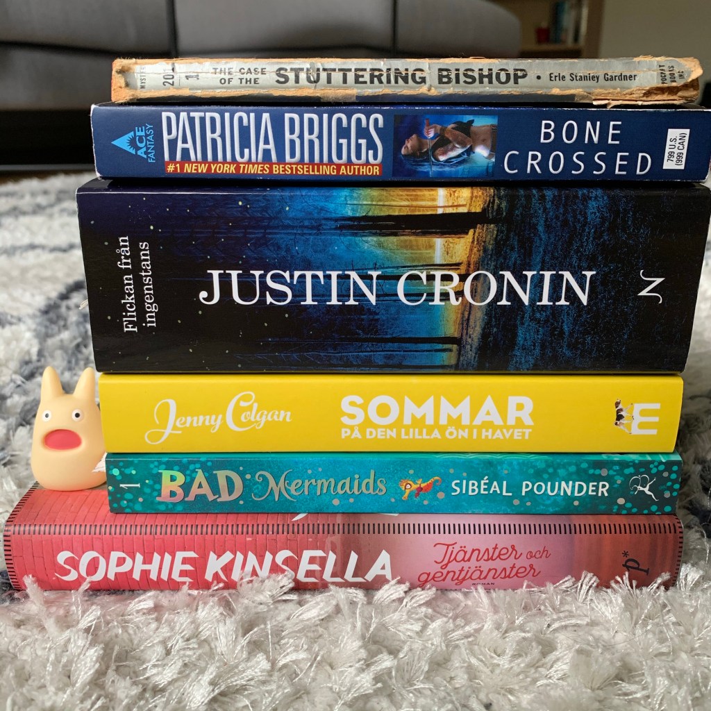 När jag satte upp min lista med böcker trodde jag inte att jag skulle hinna med alla, men nu när jag är halvvägs genom högen så tror jag att det kommer gå. Bad Mermaids är påbörjad sen tidigare, jag har ungefär 100 sidor kvar i Tjänster och gentjänster och sen är det The Case of the Stuttering Bishop och Sommar på den lilla ön i havet kvar.
