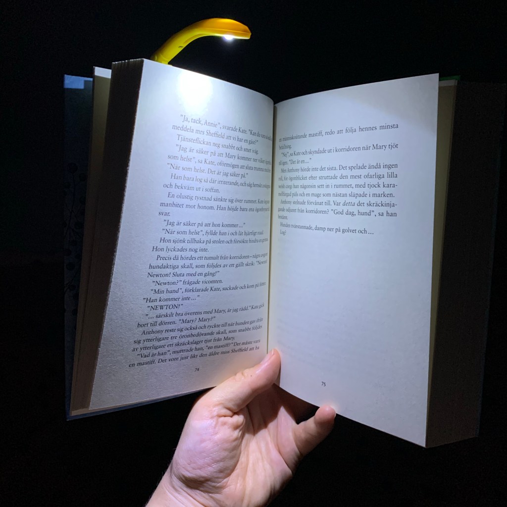 Today’s Monday post is completely dedicated to my book lamp! I got it for my birthday a few years back and it hasn’t been working properly for a while. I thought there was a glitch or something – turns out it was just the batteries! After we changed them, they have been working splendid. It was probably bad batteries already when I got it. I don’t have a nightstand lamp so it is superb to have my lamp back!