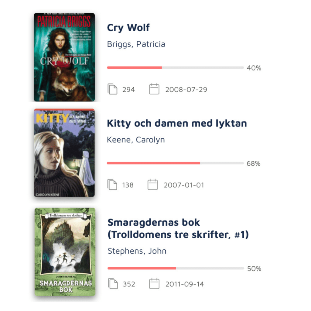 Jag har inte avslutat några böcker sen förra vecka tror jag, men en del sidor har blivit lästa. Det är tillfredsställande att se den röda biten i antal sidor-grafen öka så det uppdateras flitigt där.