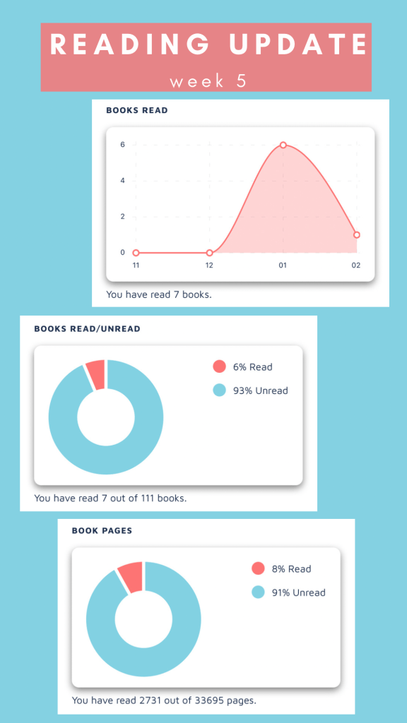 Jag kände att jag ville uppdatera mina veckosummeringar lite så februaris färg blir blå. Nu är jag nära att ha läst 10% av mina alla sidor! Än så länge har det inte dykt upp några nya böcker i hyllan som förvirrar statistiken något men det dröjer nog inte jättelänge innan det ploppar in någon mer bok i mina hyllor, det är några böcker som är beställda som kanske börjar dyka upp innan veckan är slut.
