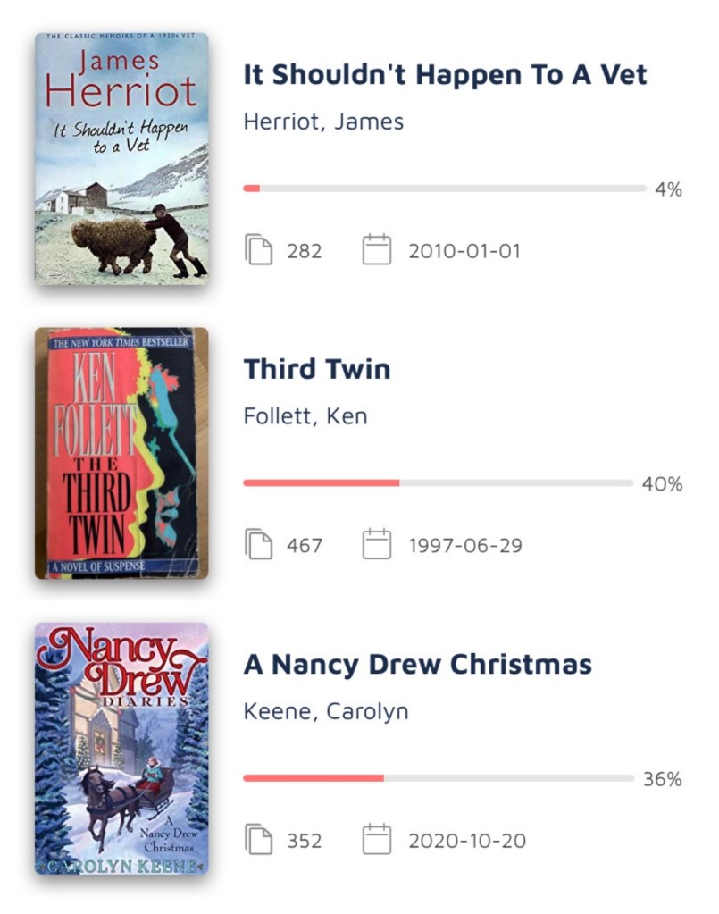 Just nu läser jag främst tre böcker. It Shouldn’t Happen to a Vet, The Third Twin och A Nancy Drew Christmas.