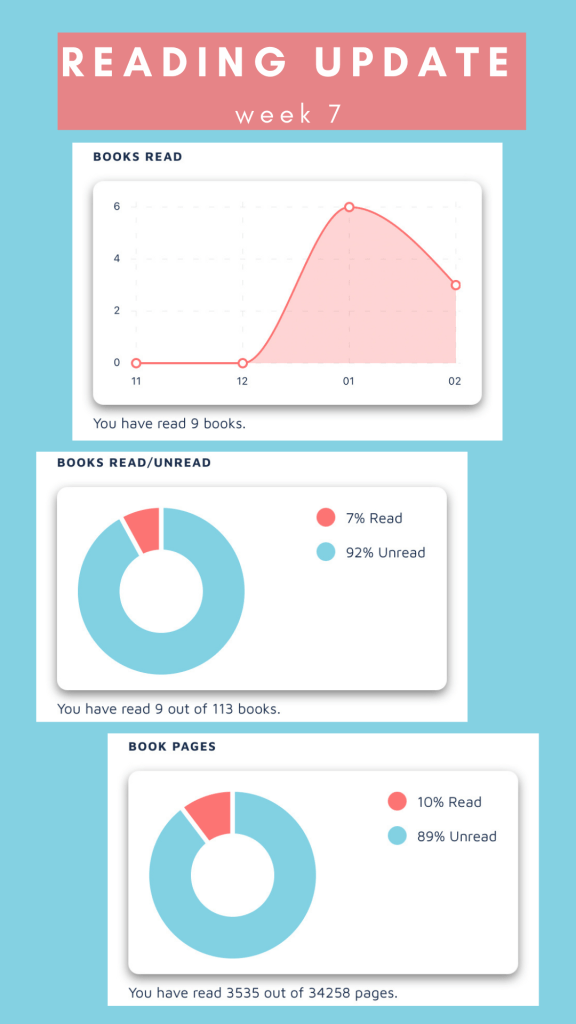 Jag har på något vis hamnat nästan en vecka fel. Den här bilden visar då min statistik över mina lästa böcker och sidor (från min egna samling) från förra veckan, och nu är nästan den här slut.