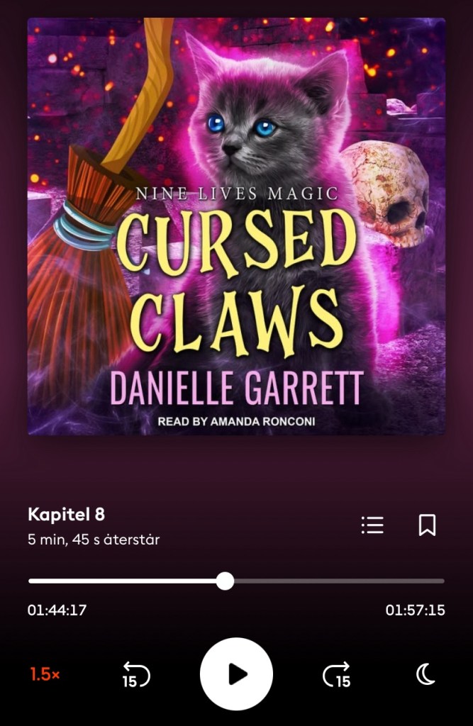 I am currently listening to Cursed Claws, book number three in the series Nine Lives Magic by Danielle Garrett. It is a cozy listen and a bit different to the Beechwood Harbor Magic Mystery series. I like the cat, she is my favourite character.